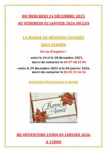 ré-ouverture le lundi 5 janvier 2026 à 13h